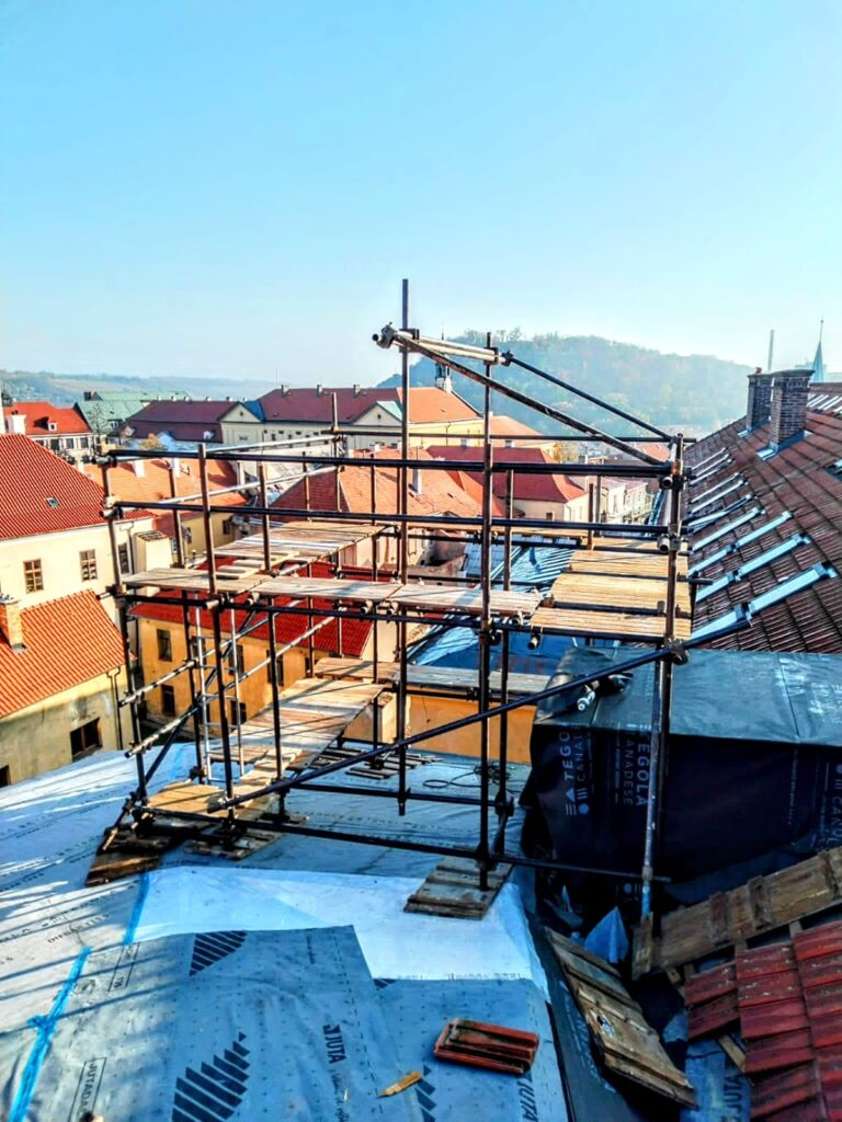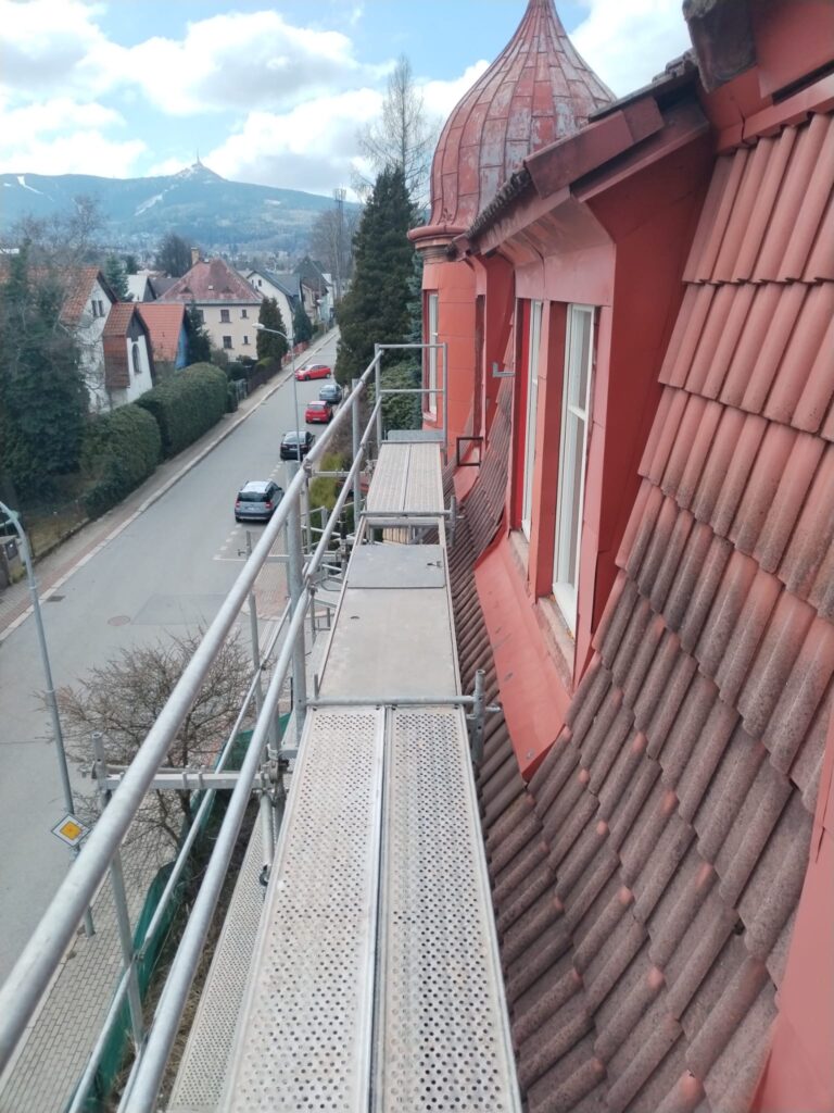 - ✅ Používáme pouze certifikované lešení odpovídající normám ČSN a EN